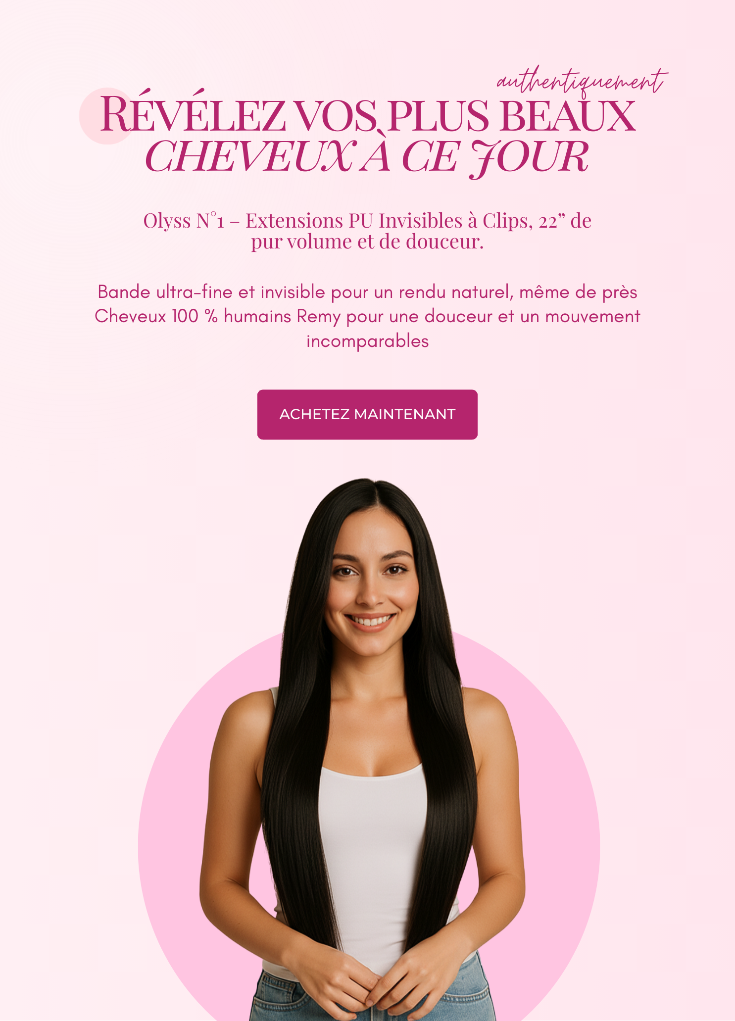 Nous avons créé Olyss N°1 pour les femmes qui souhaitent plus de volume et de beauté. Avec un fini invisible et une fluidité naturelle, nos extensions ne se fondent pas dans votre chevelure, elles s'intègrent parfaitement à votre silhouette.